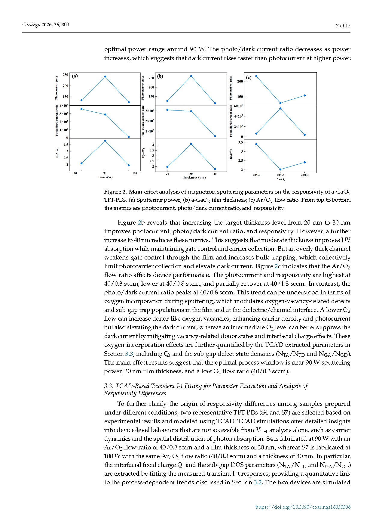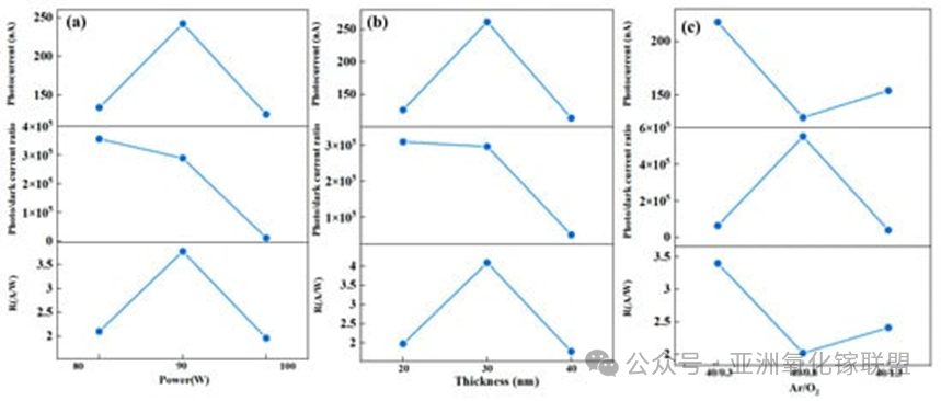 Figure 2. Main-effect analysis of magnetron sputtering parameters on the responsivity of a-GaOx TFT-PDs. (a) Sputtering power; (b) a-GaOx film thickness; (c) Ar/O2 flow ratio. From top to bottom, the metrics are photocurrent, photo/dark current ratio, and responsivity.