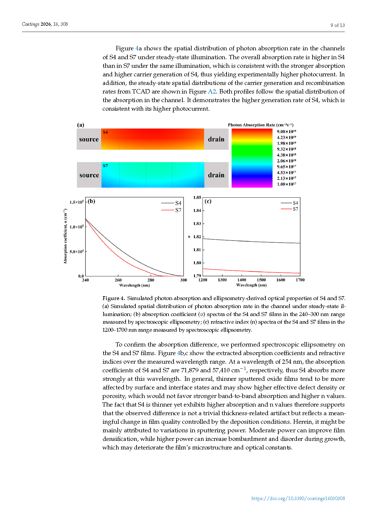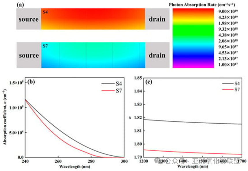 Figure 4. Simulated photon absorption and ellipsometry-derived optical properties of S4 and S7. (a) Simulated spatial distribution of photon absorption rate in the channel under steady-state illumination; (b) absorption coefficient (α) spectra of the S4 and S7 films in the 240–300 nm range measured by spectroscopic ellipsometry; (c) refractive index (n) spectra of the S4 and S7 films in the 1200–1700 nm range measured by spectroscopic ellipsometry.