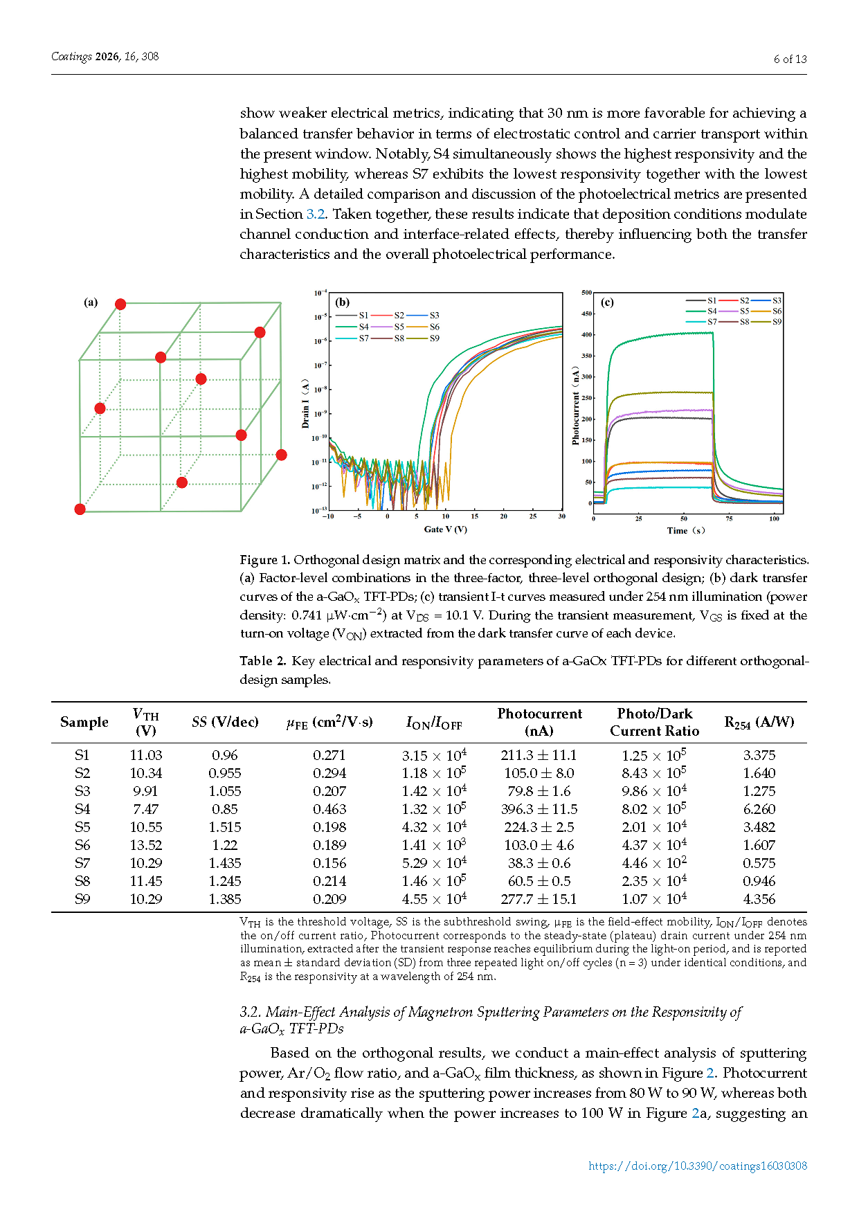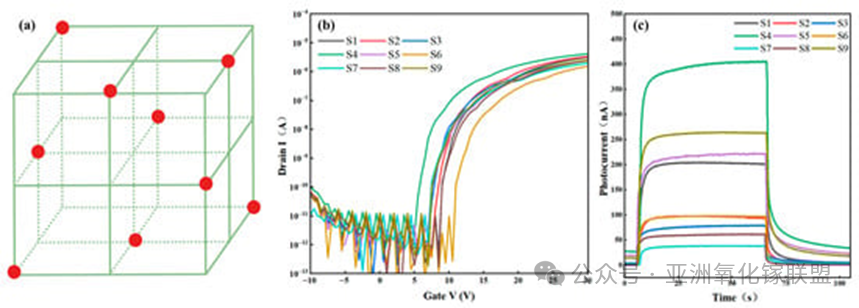 Figure 1. Orthogonal design matrix and the corresponding electrical and responsivity characteristics. (a) Factor-level combinations in the three-factor, three-level orthogonal design; (b) dark transfer curves of the a-GaOx TFT-PDs; (c) transient I-t curves measured under 254 nm illumination (power density: 0.741 µW∙cm−2) at VDS = 10.1 V. During the transient measurement, VGS is fixed at the turn-on voltage (VON) extracted from the dark transfer curve of each device.