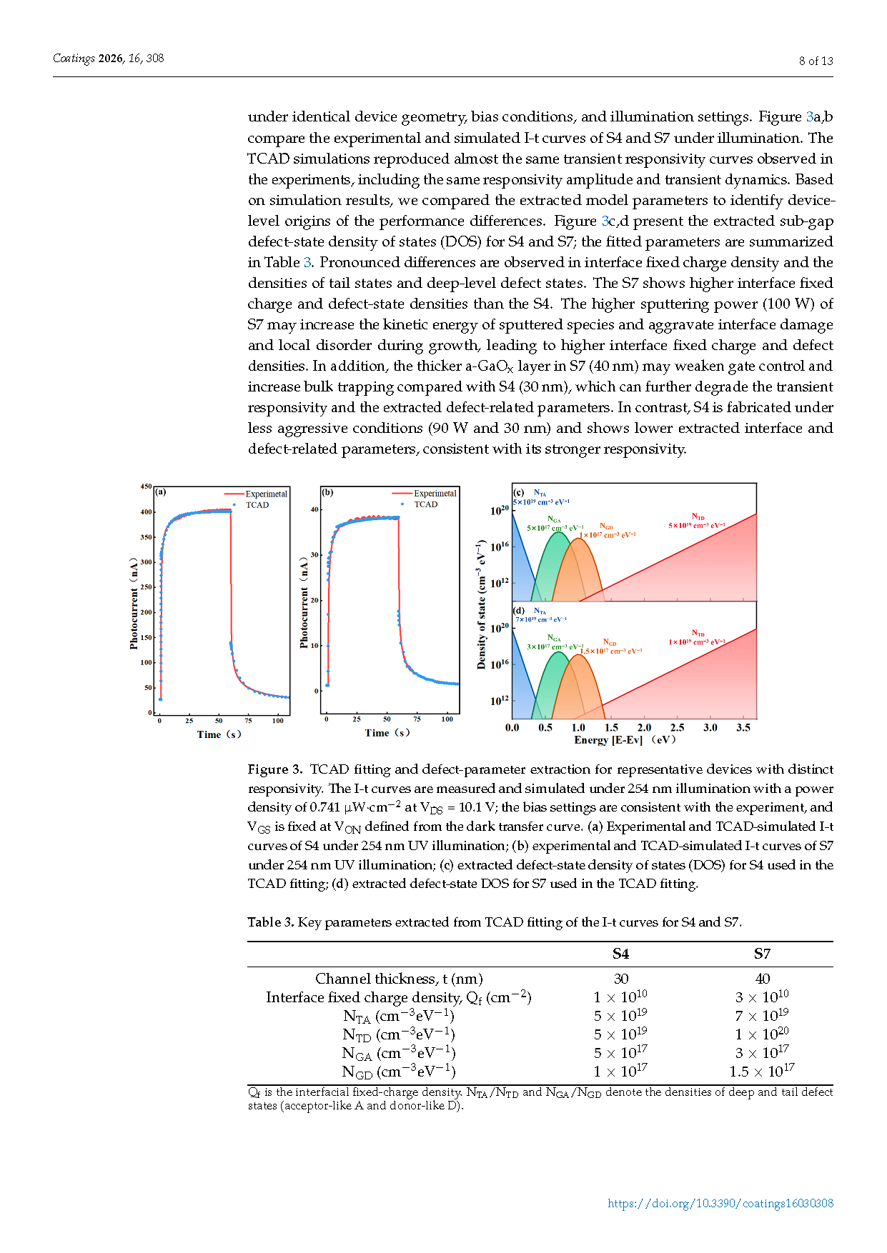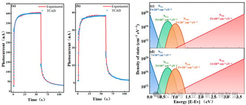 Figure 3. TCAD fitting and defect-parameter extraction for representative devices with distinct responsivity. The I-t curves are measured and simulated under 254 nm illumination with a power density of 0.741 µW∙cm−2 at VDS = 10.1 V; the bias settings are consistent with the experiment, and VGS is fixed at VON defined from the dark transfer curve. (a) Experimental and TCAD-simulated I-t curves of S4 under 254 nm UV illumination; (b) experimental and TCAD-simulated I-t curves of S7 under 254 nm UV illumination; (c) extracted defect-state density of states (DOS) for S4 used in the TCAD fitting; (d) extracted defect-state DOS for S7 used in the TCAD fitting.