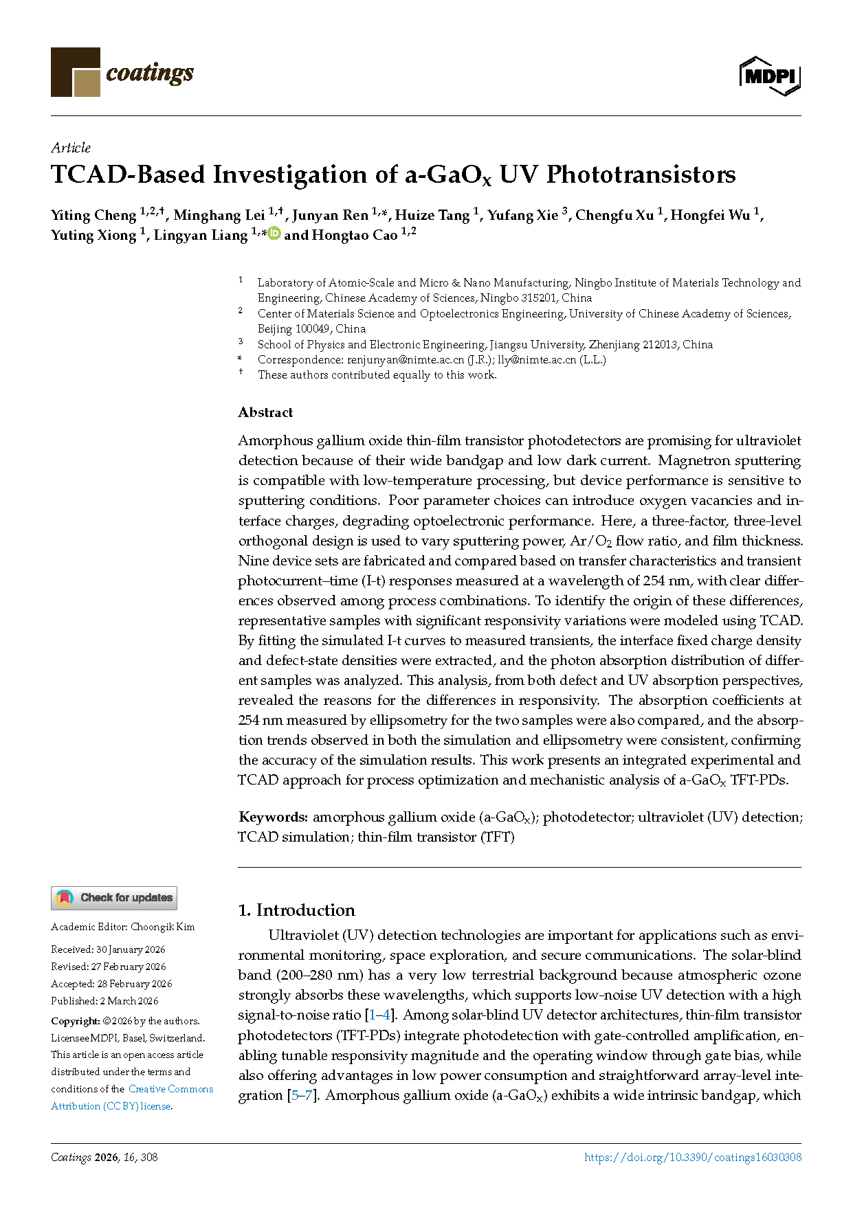 Researchers from the Ningbo Institute of Materials Technology and Engineering, Chinese Academy of Sciences have published a dissertation titled " TCAD-Based Investigation of a-GaOx UV Phototransistors" in Coatings.