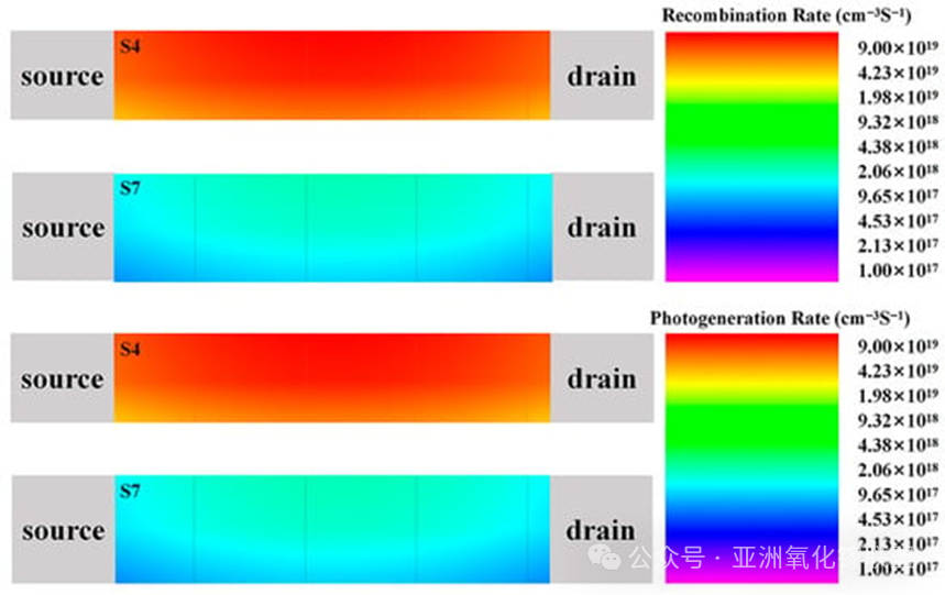 Figure A2. TCAD-simulated steady-state spatial distributions of photogeneration and recombination rates in the channels of S4 and S7.