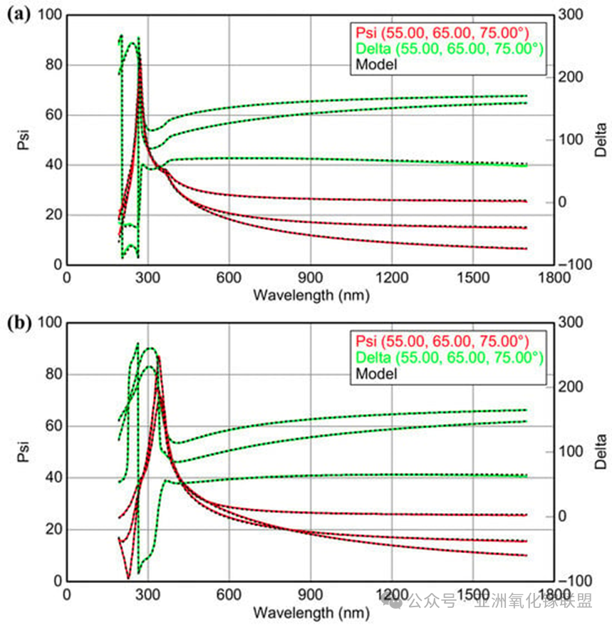 Figure A1. Variable-angle spectroscopic ellipsometry (VASE) data and model fitting results for a-GaOx films deposited on Si substrates. (a) S4 film; (b) S7 film.