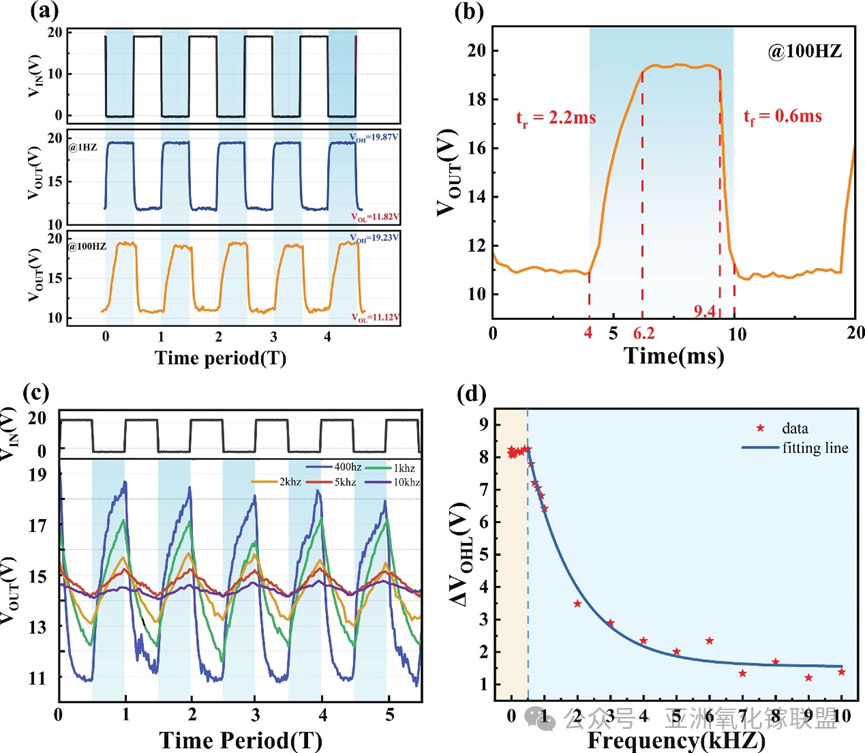 Fig. 4. (a) Time-domain response of inverter under low frequency; (b) rise-time and fall-time of inverter at 100 Hz; (c) time-domain response of inverter under high frequency; (d) voltage difference attenuation characteristic.