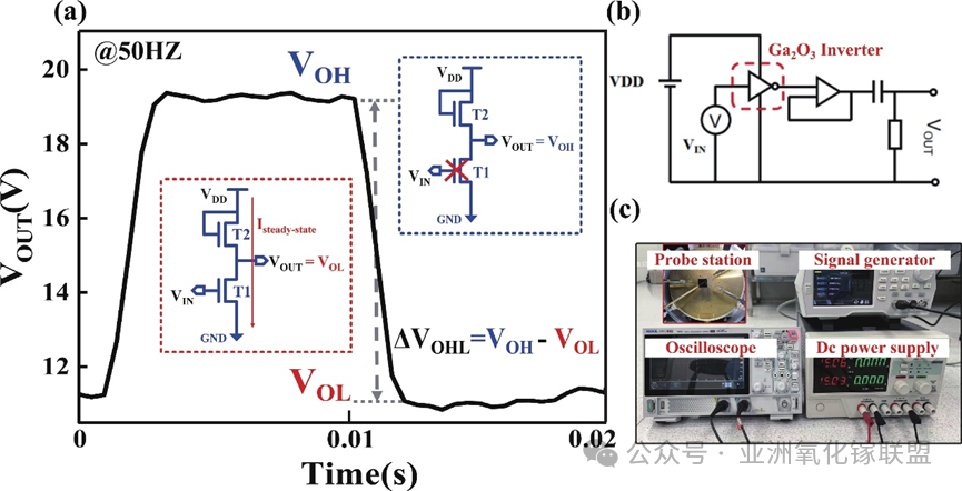 Fig. 3. (a) Operation of inverter circuit at low and high input. The experimental VOUT−T curve is measured at 50 Hz of VIN square wave signal; (b) schematic of test circuit; (c) photograph of the β-Ga2O3 MOSFET-based inverter and the testing platform.