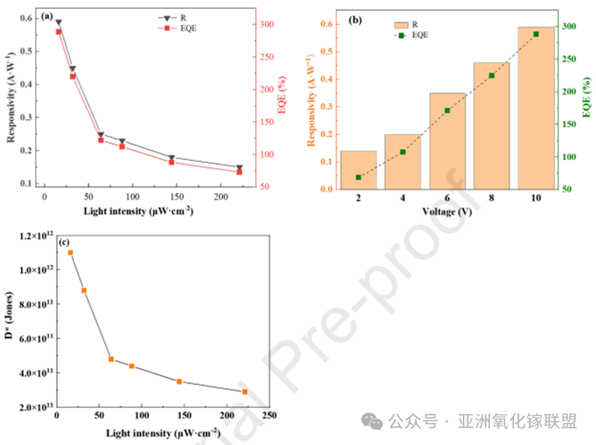 The responsivity and specific detectivity were calculated to be 0.59 A/W and 1.1 × 1012 Jones.