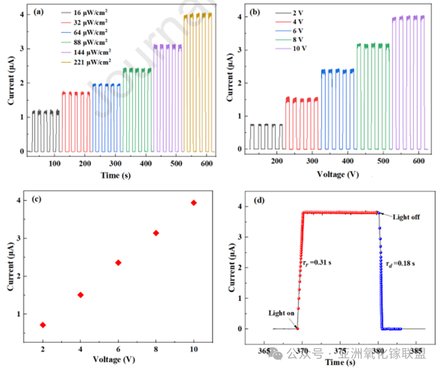 Fig. 5 (a) The I-t curves of Cu: β-Ga2O3 nanowire photodetector under different light power densities at 10 V. (b) The I-t curves of device at various voltages. (c) The photocurrent dependence on the versus bias voltage. (d) The time response curve of 254 nm UV irradiation single pulse.