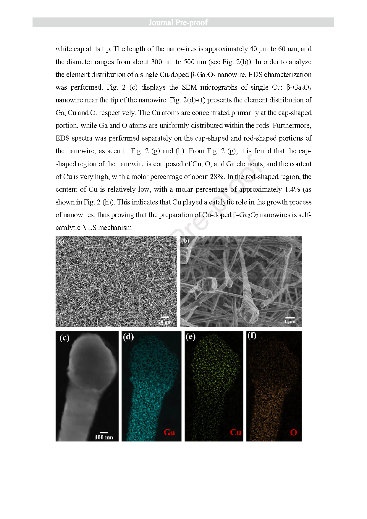Fig. 2 The SEM image of Cu: β-Ga2O3 nanowires: (a) Low-magnification, (b) High-magnification, and (c) The single nanowire near the tip. The EDS images of (d) Ga, (e) Cu, and (f) O element distribution. The EDS spectra of a single Cu: β-Ga2O3 nanowire: (g) Cap-shaped portion; (h) Rod-shaped portion.