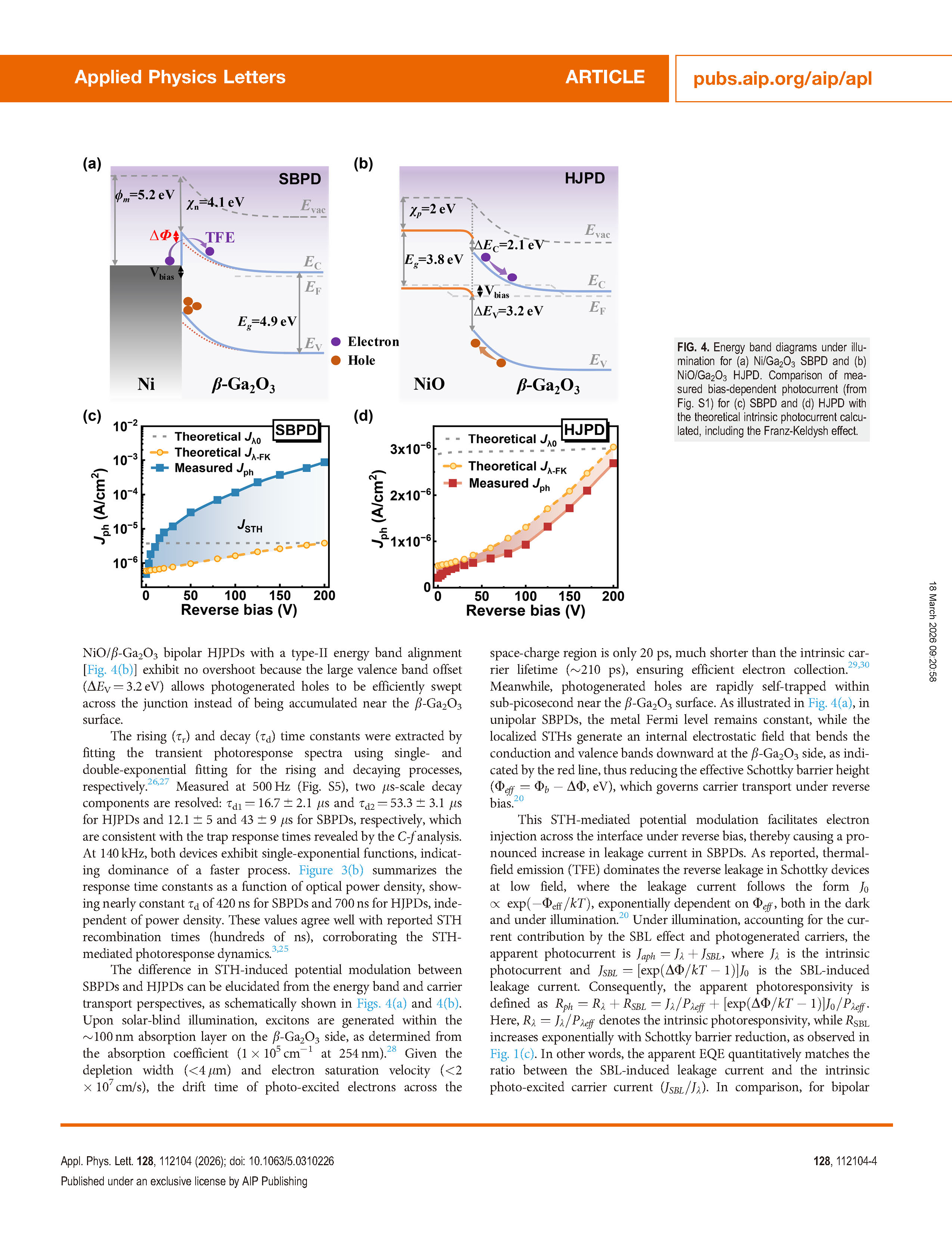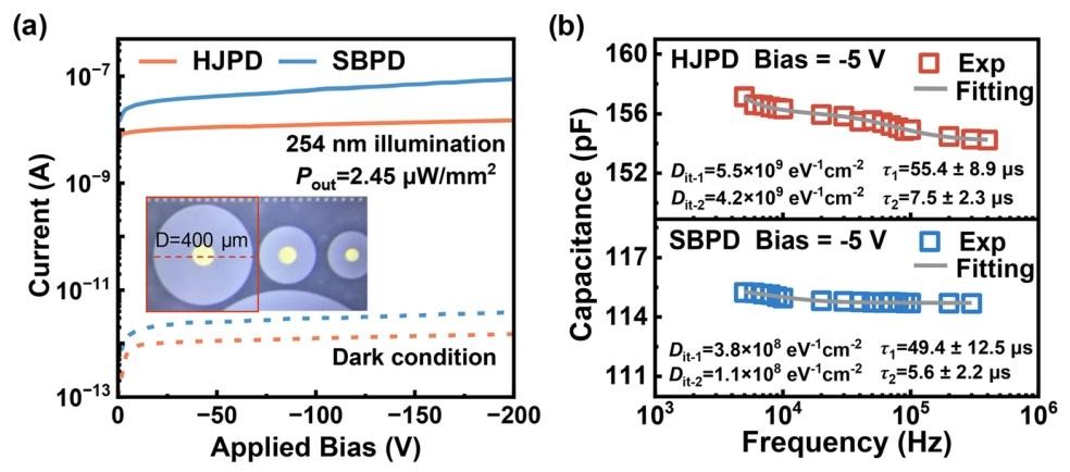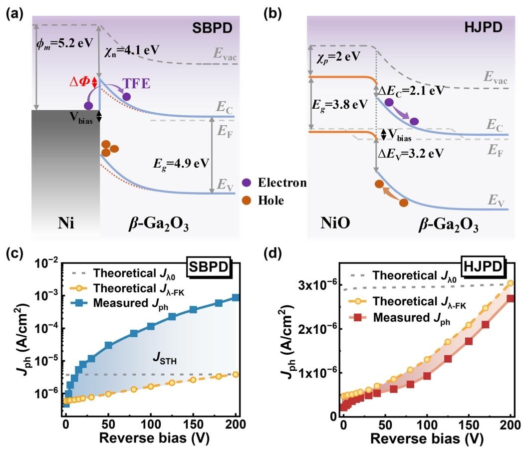 β-Ga₂O₃ as an ultrawide-bandgap semiconductor with a bandgap of 4.6–4.9 eV and excellent thermal stability, is a core candidate for solar-blind photodetectors. Such devices are mainly divided into photoconductive and photovoltaic types, and the photovoltaic type includes Schottky barrier photodiodes (SBPD) and heterojunction photodiodes (HJPD). Previous studies have found that Ga₂O₃-based SBPDs often exhibit anomalously high photoresponsivity far exceeding the theoretical photovoltaic limit, while this phenomenon is rarely observed in HJPDs. The performance difference between the two cannot be explained only by differences in optical absorption and electric field distribution, and the avalanche multiplication effect can be excluded. Two hypotheses have been proposed in the academic community to explain the Schottky barrier lowering (SBL) effect: minority carrier trapping by interface traps and accumulation of photogenerated self-trapped holes (STH) on the surface, but neither has been quantitatively verified. β-Ga₂O₃ has the highest hole self-trapping energy and the lowest self-trapping formation barrier, and holes can stably form STH within sub-picoseconds. This intrinsic characteristic significantly affects its optoelectronic behavior. To solve the problem of responsivity difference between the two types of photovoltaic devices, the team fabricated SBPD and NiO/β-Ga₂O₃ HJPD on the same epitaxial substrate, and quantitatively analyzed the STH-mediated photoresponse mechanism by combining bias-dependent photoresponse spectra, photocurrent transient spectra, Franz-Keldysh (F-K) effect modeling and Technology Computer Aided Design (TCAD) simulation, providing physical support for the device design of ultrawide-bandgap photodetectors.