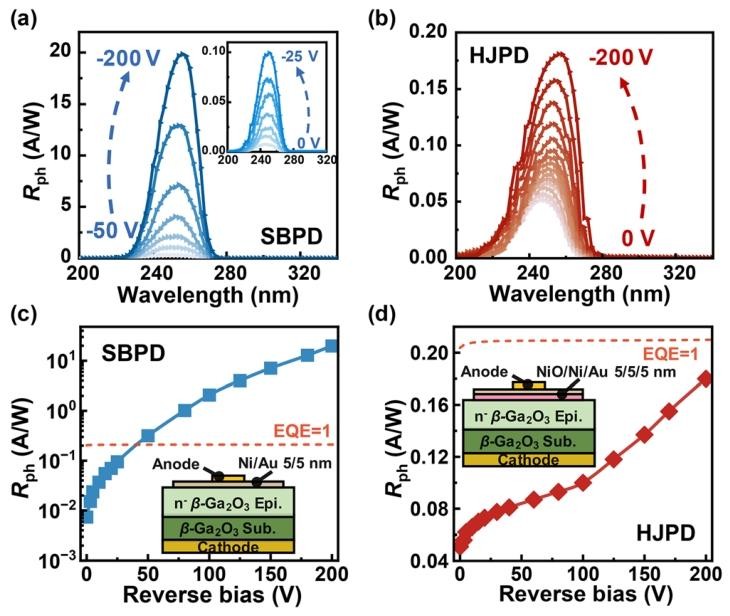 FIG. 1. Bias-dependent photoresponse spectra of (a) SBPDs and (b) HJPDs. Peak photoresponsivity (Rph) as a function of reverse biases for (c) SBPDs and (d) HJPDs (EQE = 1). Insets show schematics of the SBPD and HJPD device structures.