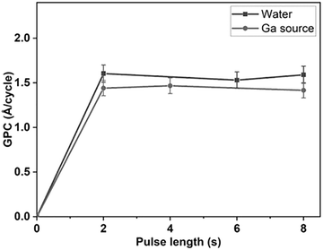 Fig. 2. GPC as a function of precursor pulse length for Ga(triaz)3 (grey circles) and water (black squares) during ALD at 400 °C. When varying the pulse length of one precursor, the other was held constant at 8 s (i.e. water = 8 s when Ga(triaz)3, was varied, and Ga(triaz)3 = 8 s when water was varied).