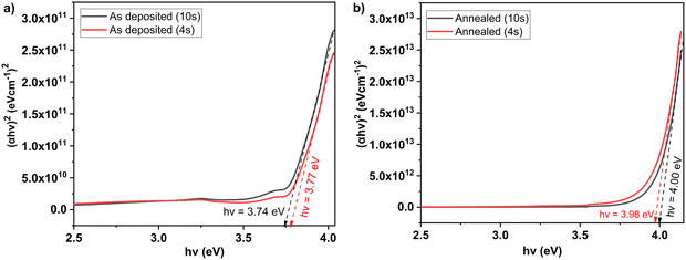 Fig. 8. Tauc plots for Ga2O3 films on glass deposited with 10 s and 4 s water pulses: (a) as-deposited; (b) annealed at 500 °C for 4 h in ambient air. Bandgaps were extracted by linear extrapolation of the near-edge region to the energy axis. Annealing shifts the absorption edge to higher energy, increasing the apparent bandgap.