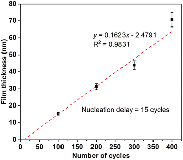 Fig. 4. Film thickness versus number of ALD cycles for Ga2O3 on Si at 400 °C. A linear fit to the data indidicates an average GPC of 1.62 Å per cycle and a nucleation delay of ∼15 cycles (from the y-intercept).