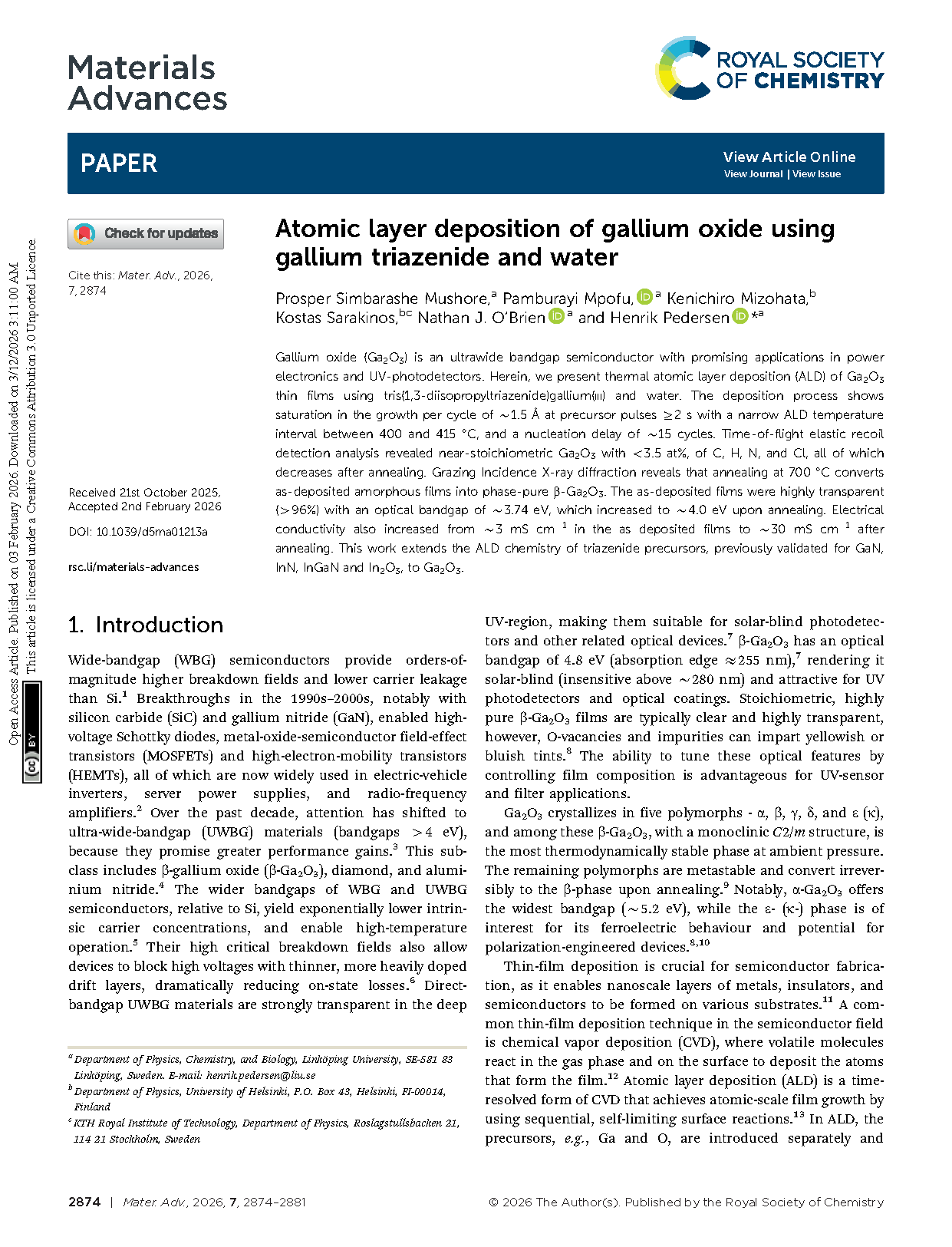Researchers from the Linköping University have published a dissertation titled " Atomic layer deposition of gallium oxide using gallium triazenide and water " in Materials Advances.