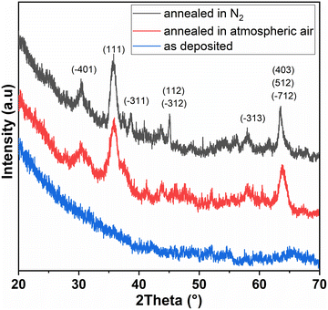 Fig. 5. GI-XRD patterns of Ga2O3 films: as-deposited (blue), annealed in ambient air (red), and annealed in N2 (black), all at 700 °C for 2 h. Sharp diffraction peaks confirm crystallization to monoclinic β-Ga2O3; a strong (111) reflection at ∼35.6° is observed under both annealing conditions.