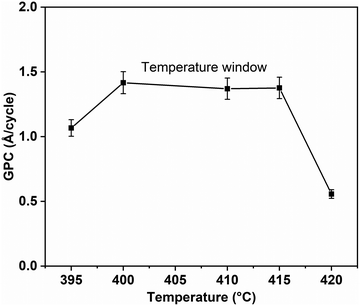 Fig. 3. GPC as a function of temperature. Measurable film growth was observed between 395–420 °C, with a narrow ALD interval identified between 400–415 °C where GPC remains approximately constant. ALD cycles used 8 s pulses for both Ga(triaz)3 and water, separated by 10 s purges; all films were deposited for 300 cycles.