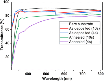 Fig. 7. Spectral transmittance of Ga2O3 films on glass, shown for as-deposited and annealed states. As-deposited films exhibit higher optical transparency than their annealed counterparts.