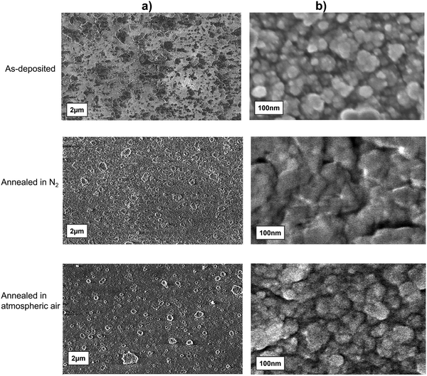 Fig. 6. SEM micrographs of Ga2O3 films: as-deposited (top); annealed in N2 (middle); annealed in ambient air (bottom). (a) Left column: low-magnification images; (b) right column: high-magnification images. Air-annealed films appear denser with more uniform grains.