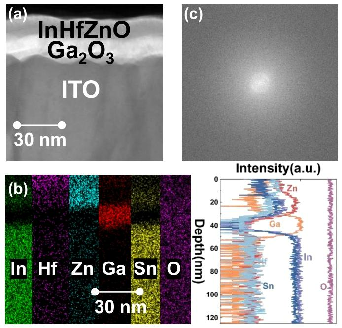 Fig.2. (a) The TEM image of the (InHfZnO/Ga2O3) heterojunction with (b) the distributions of various metal elements and (c) the FFT amorphous ring of the heterojunction.