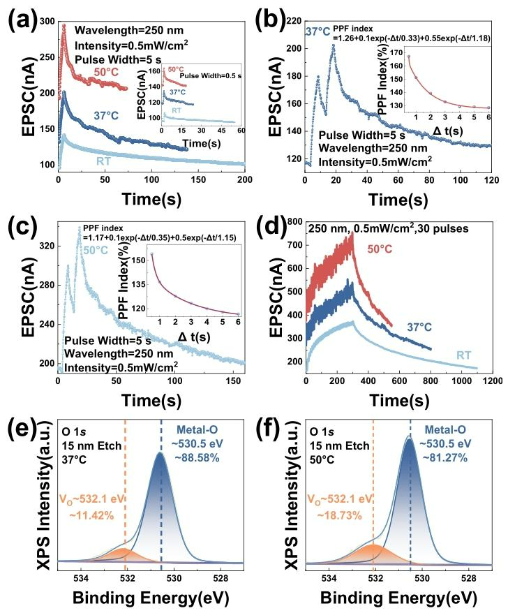 Fig. 4. (a) The STP characterizations under various temperatures. The PPF characterizations with PPF index exponential fitting at (b) 37°C and (c) 50°C. (d) The LTP characterizations under various temperatures. The in-situ XPS O 1s peak deconvolution of the heterojunction at (e) 37°C and (f) 50°C.