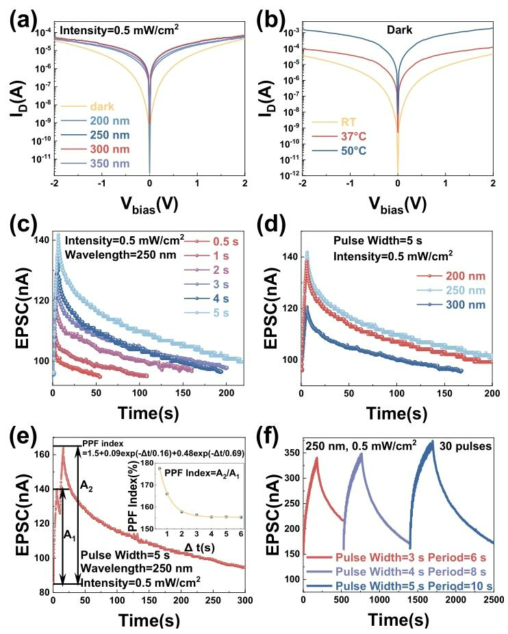 Fig. 3. The fundamental I-V characterizations of the fabricated photoelectric device under (a) various wavelengths of light applications and (b) various temperatures. The STP characterizations under (c) various widths and (d) various wavelengths of light pulse applications. (e) The PPF characterizations with the PPF index exponential fitting. (f) The LTP characterizations under various widths and periods of light pulses. The Vbias in all synaptic characterizations was set at 10 mV.