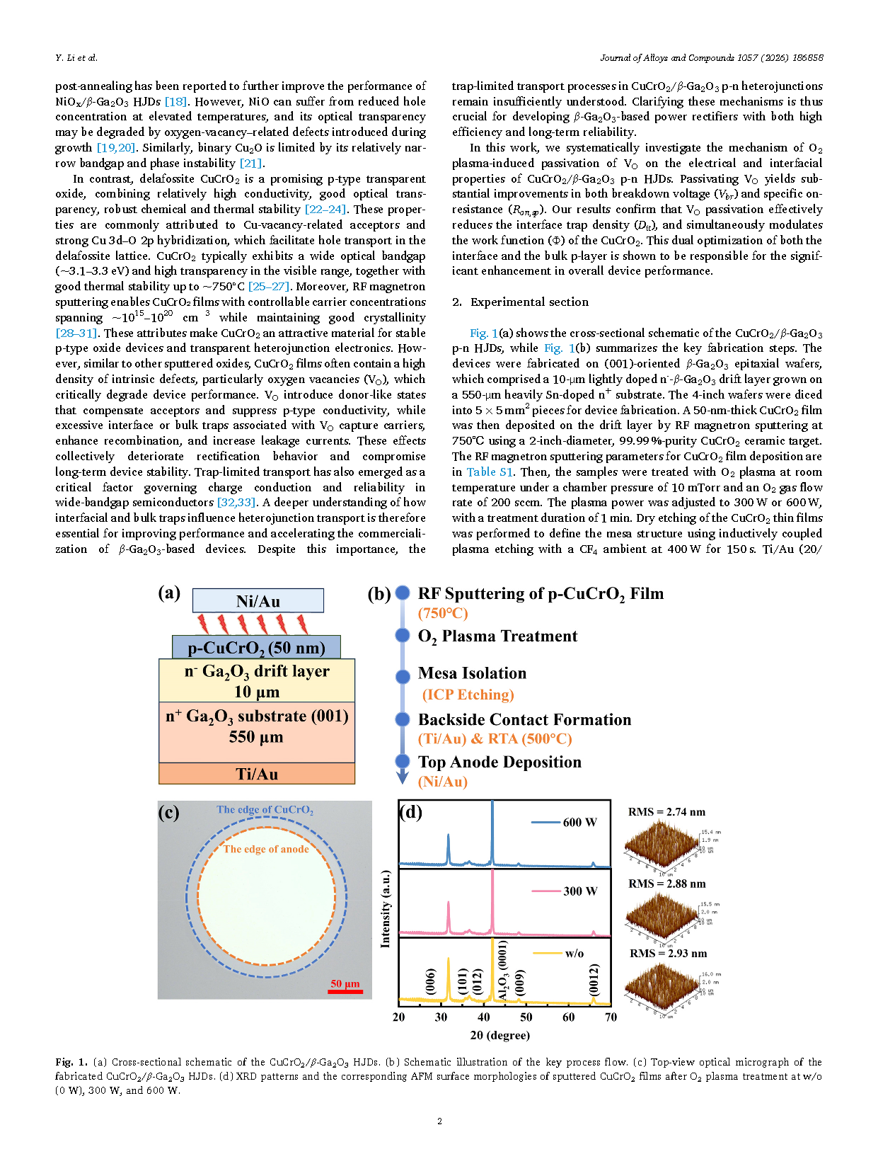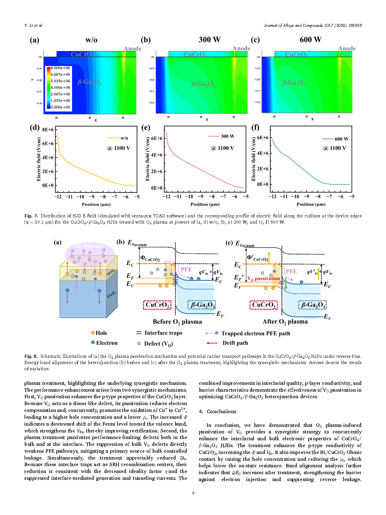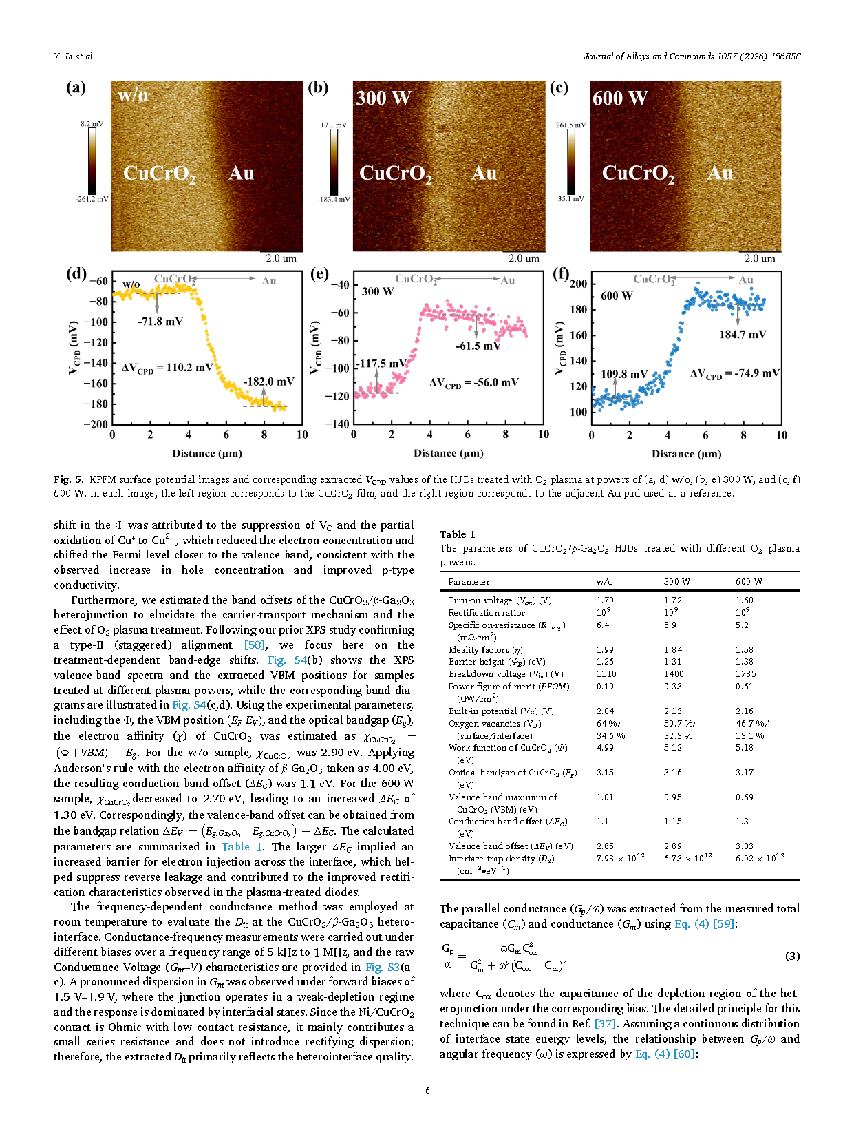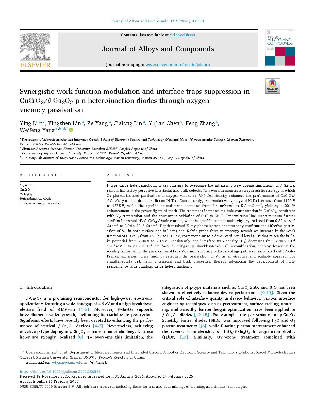 A research team led by Prof. Weifeng Yang from Xiamen University has published a paper in the international journal Journal of Alloys and Compounds, entitled:Synergistic work function modulation and interface traps suppression in CuCrO₂/β-Ga₂O₃ p-n heterojunction diodes through oxygen vacancy passivation.