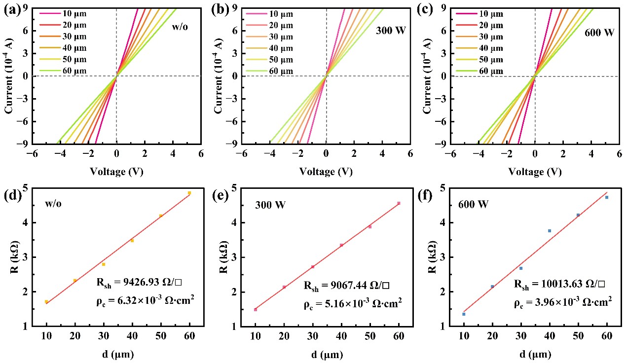 Figure 2. TLM characterization of Ni/CuCrO₂ contacts after O₂ plasma treatment at different powers.(a–c) I–V characteristics measured between adjacent TLM pads with different spacings (d = 10–60 μm) for samples treated at (a) w/o, (b) 300 W, and (c) 600 W.(d–f) Total resistance (R) extracted from the I–V slopes as a function of spacing (d), along with corresponding linear TLM fitting for (d) w/o, (e) 300 W, and (f) 600 W samples.