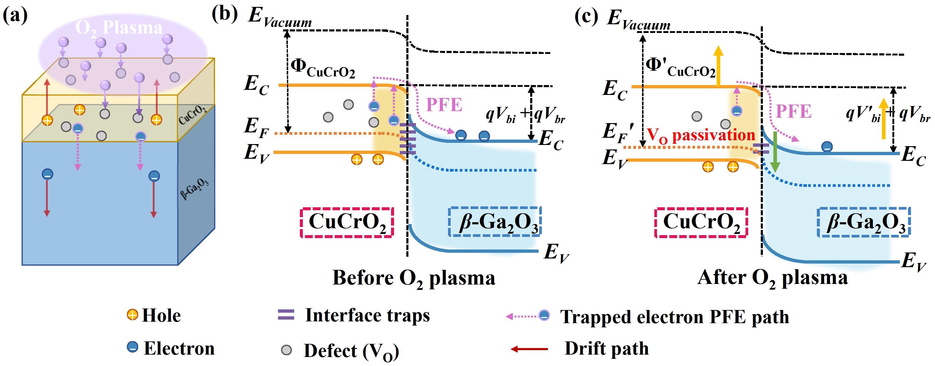 Figure 8.(a) Schematic illustration of the O₂ plasma passivation mechanism and carrier transport paths in CuCrO₂/β-Ga₂O₃ HJDs under reverse bias.(b, c) Energy band alignment of the heterojunction before and after O₂ plasma treatment, highlighting the synergistic mechanism. Arrows indicate the direction of changes.