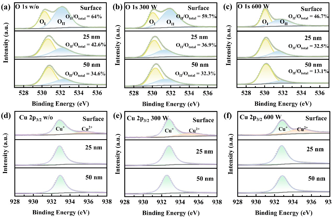 Figure 4. XPS depth profiles of O 1s and Cu 2p₃/₂ core levels in CuCrO₂ films after O₂ plasma treatment at (a, d) w/o, (b, e) 300 W, and (c, f) 600 W.