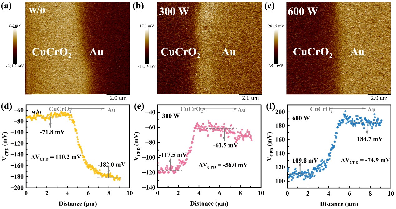 Figure 5. KPFM surface potential images and corresponding extracted contact potential difference (V_CPD) values of HJDs after O₂ plasma treatment at (a, d) w/o, (b, e) 300 W, and (c, f) 600 W. In each image, the left region corresponds to the CuCrO₂ film, while the right region corresponds to the adjacent Au pad used as a reference.