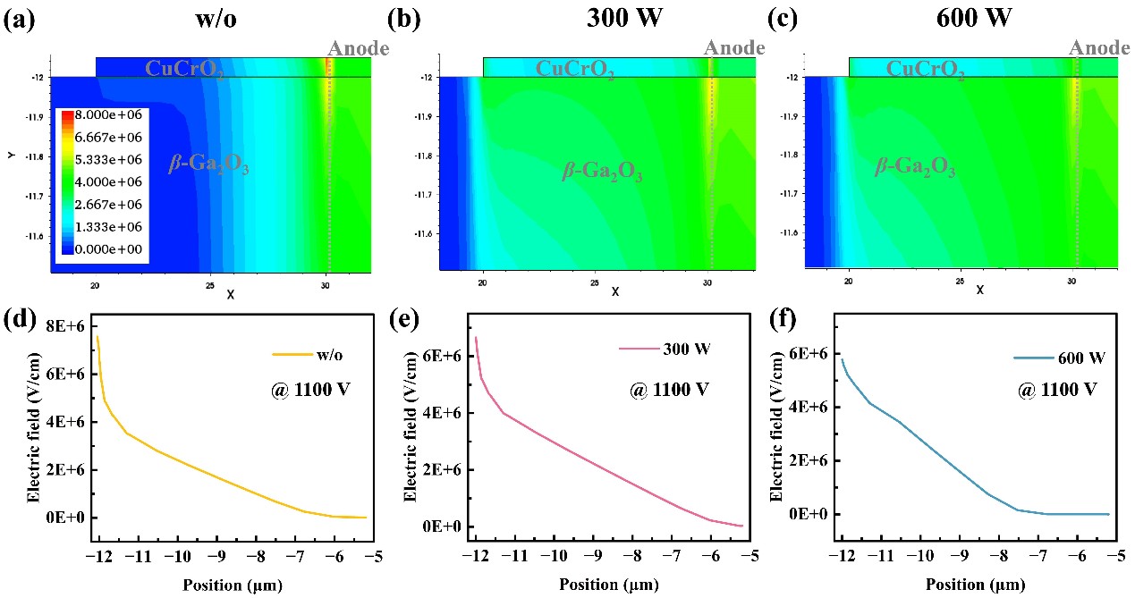 Figure 7.Electric field distribution of CuCrO₂/β-Ga₂O₃ HJDs (simulated using Sentaurus TCAD) after O₂ plasma treatment at (a, d) w/o, (b, e) 300 W, and (c, f) 600 W. The corresponding electric field profiles along the cutline at the device edge (x = 30.1 μm) are also shown.