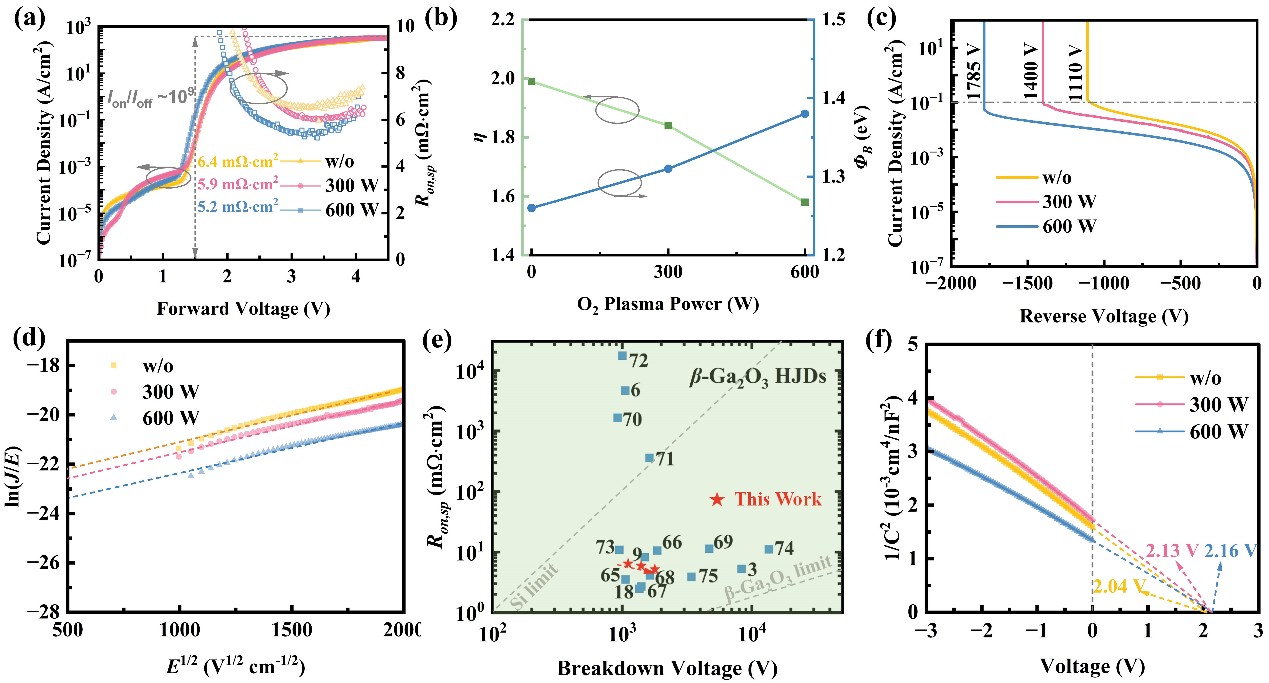 Figure 3.(a) Semi-log forward J–V characteristics and extracted relationship between Ron,sp and forward bias.(b) Variation of ideality factor (η) and barrier height (ΦB).(c) Semi-log reverse J–V characteristics.(d) ln(J/E) versus E¹ᐟ² plots under reverse bias.(e) Benchmark comparison of Ron,sp and breakdown voltage (V_br) for advanced vertical β-Ga₂O₃-based HJDs.(f) 1/C²–V characteristics of CuCrO₂/β-Ga₂O₃ HJDs measured at 1 MHz after O₂ plasma treatment at w/o, 300 W, and 600 W.