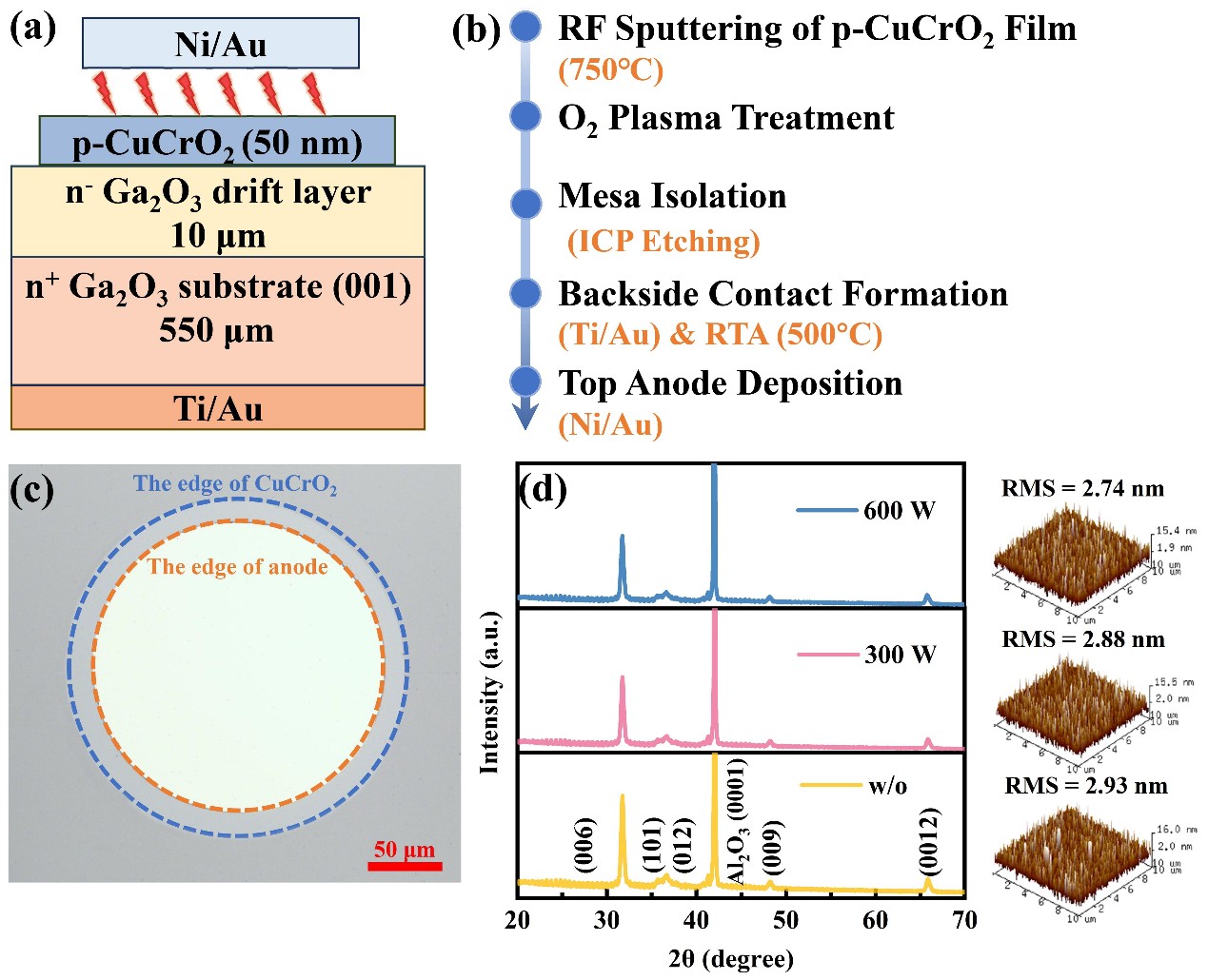 Figure 1.(a) Cross-sectional schematic of the CuCrO₂/β-Ga₂O₃ HJD.(b) Schematic illustration of the key fabrication process.(c) Top-view optical microscope image of the fabricated CuCrO₂/β-Ga₂O₃ HJD.(d) XRD patterns and corresponding AFM surface morphologies of sputtered CuCrO₂ films after O₂ plasma treatment at w/o (0 W), 300 W, and 600 W.