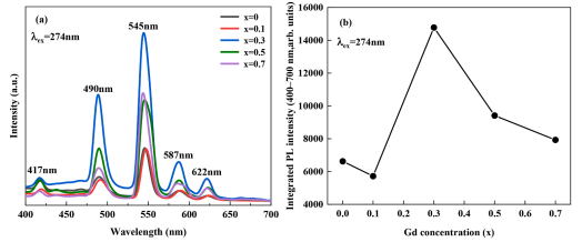 Fig. 5. (a) PL spectra of (GdxGa1-x)2O3: Tb3+ materials with different Gd3+ contents (λex =274 nm) (b) The integrated PL yield of Tb3+ ions as a function of the x parameter upon excitation of Gd3+ ions (274 nm).
