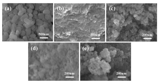 Fig. 1. SEM plots of (GdxGa1-x)2O3: Tb3+ materials with different doping concentrations, (a) 0, (b) 0.1, (c) 0.3, (d) 0.5, and (e) 0.7.