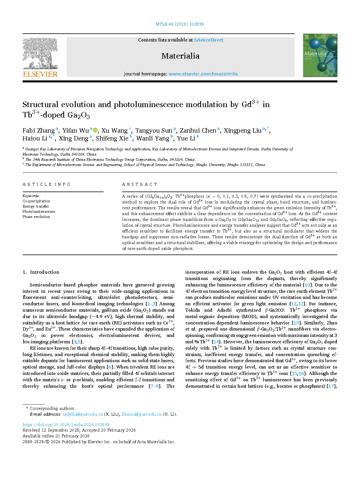 Researchers from the Guilin University of Electronic Technology, The 34th Research Institute of China Electronics Technology Group Corporation and Ningbo University have published a dissertation titled "Structural evolution and photoluminescence modulation by Gd³⁺ in Tb³⁺-doped Ga₂O₃" in Materialia.