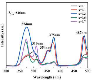 Fig. 4. PLE spectra of (GdxGa1-x)2O3: Tb3+ materials with different Gd3+ contents (λem=545 nm).