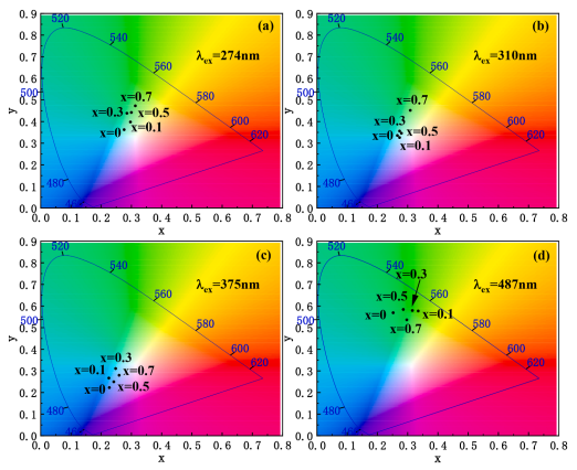 Fig. 6. Chromaticity coordinates of the emission spectra of (GdxGa1-x)2O3: Tb3+ materials with different Gd3+ contents, λex for (a) 274 nm, (b) 310 nm, (c) 375 nm and (d) 487 nm respectively.
