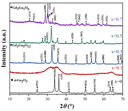 This study systematically investigated the effect of Gd3+ concentration on the structural evolution and photoluminescent properties of (GdxGa1-x)2O3: Tb3+ phosphors. With increasing Gd3+ content, the host lattice underwent a distinct phase transition from α-Ga2O3 to cubic Gd3Ga5O12 and then to orthorhombic Gd3Ga1O6. Among these, the garnet-type Gd3Ga5O12 phase obtained at x = 0.3 provided the most favorable host environment for Tb3+ activation, yielding the strongest green luminescence.
