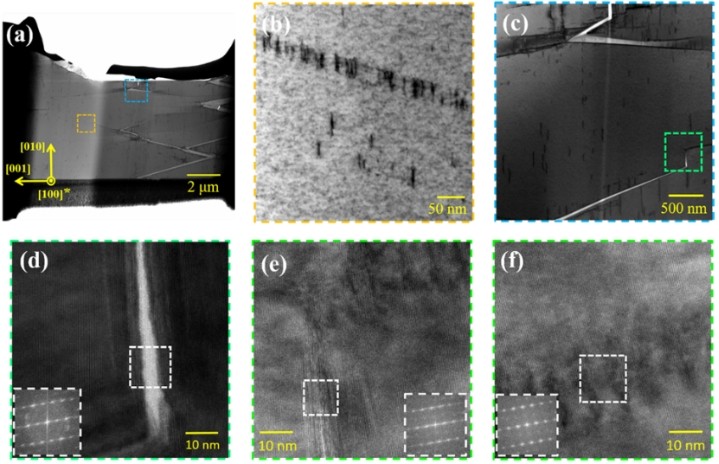 Figure 6. (a) TEM images of the type II hillock. (b) Bright-field TEM images of the orange area, as noted in Figure 8a. (c) Bright-field TEM images of the blue area, as noted in Figure 8a. (d), (e) and (f) high-resolution TEM of the green-marked region and its corresponding FFT pattern.