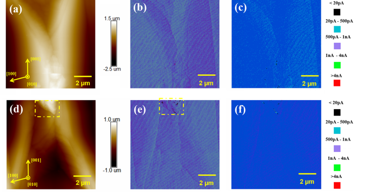 Figure 3. C-AFM images of a type I hillock. The upper part of a type I hillock: (a) AFM morphology image, (b) current mapping image measured at -6 V, (c) corresponding current intensity image. The lower part of a type I hillock: (d) AFM morphology image, (e) current mapping image measured at -6 V, (f) corresponding current intensity image.