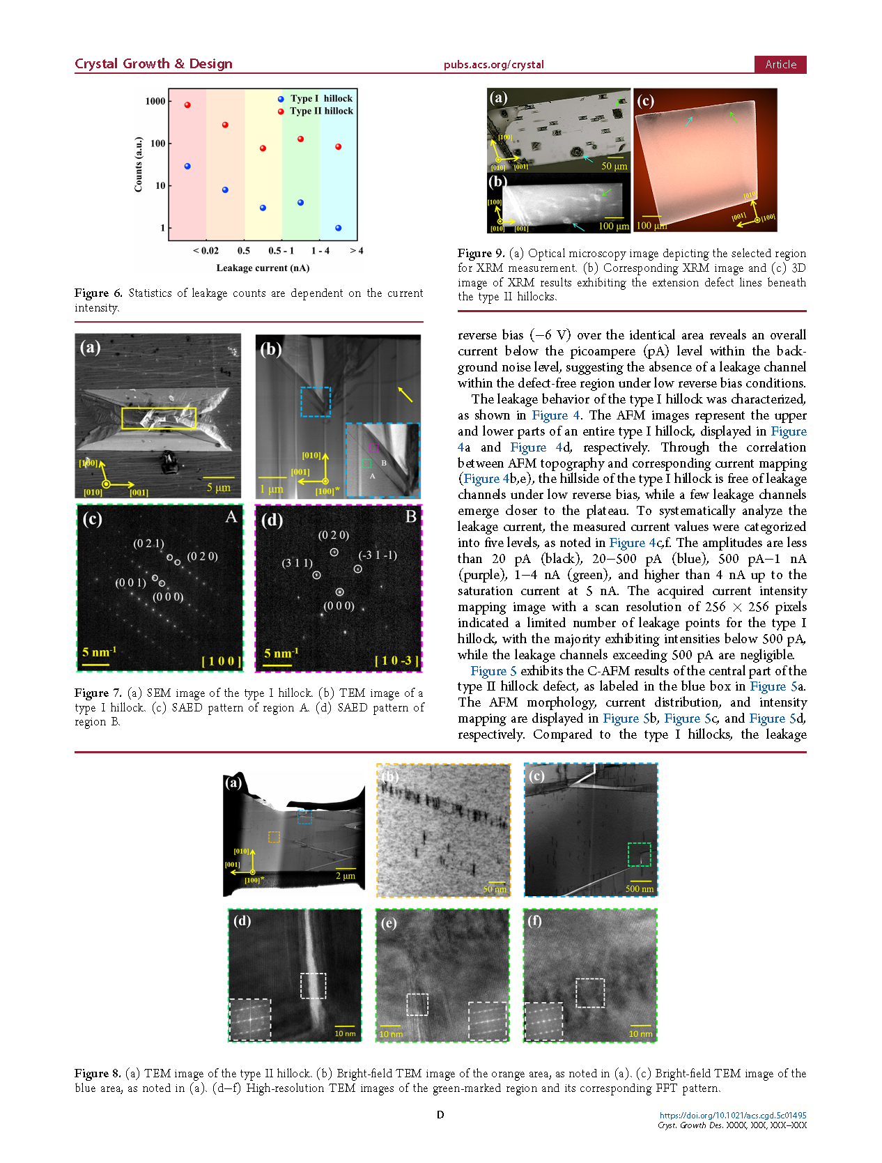 The microscopic mechanisms underlying the differences in leakage currents between two types of defects have been revealed. The study found that continuous dislocation slipping occurred in a certain direction, with interconnected void-like defects located beneath the type II hillock. At the same time, one can observe characteristic structures associated with the nanopipes that extend to the substrate surface and generate screw dislocations below. These microscopic defects collectively form effective leakage channels under low reverse bias, fundamentally explaining the root cause of the high leakage current caused by Type II hillock defects from a mechanistic perspective.