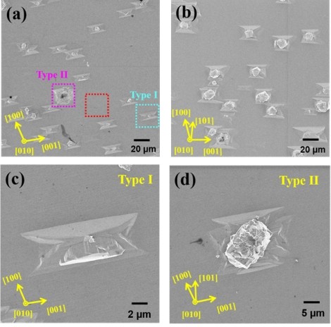 Figure 1. SEM images of the (010) surface: (a) type I hillock is predominant, (b) type II shows a wide distribution. The enlarged SEM of type I and type II hillocks, respectively, in (c) and (d).