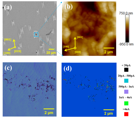 Figure 4. (a) SEM images of the C-AFM measurement area on the type II hillock. C-AFM images of the type II hillock: (b) morphology image, (c) current image measured at a reverse bias of 4 V, (d) current distribution image.