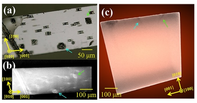 Figure 7. (a) The optical microscope image depicting the selected region for XRM measurement. (b) the corresponding XRM image and (c) 3D images of XRM results exhibiting the extension defect lines beneath the type II hillocks.