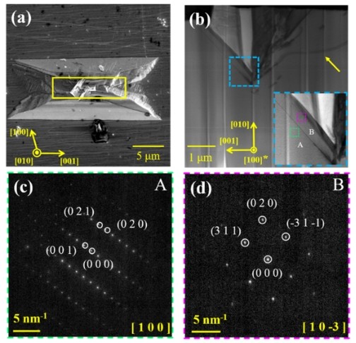 Figure 5. (a) SEM images of the type I hillock. (b) TEM images of a type I hillock. (c) The SAED pattern of region A. (d) The SAED pattern of region B.