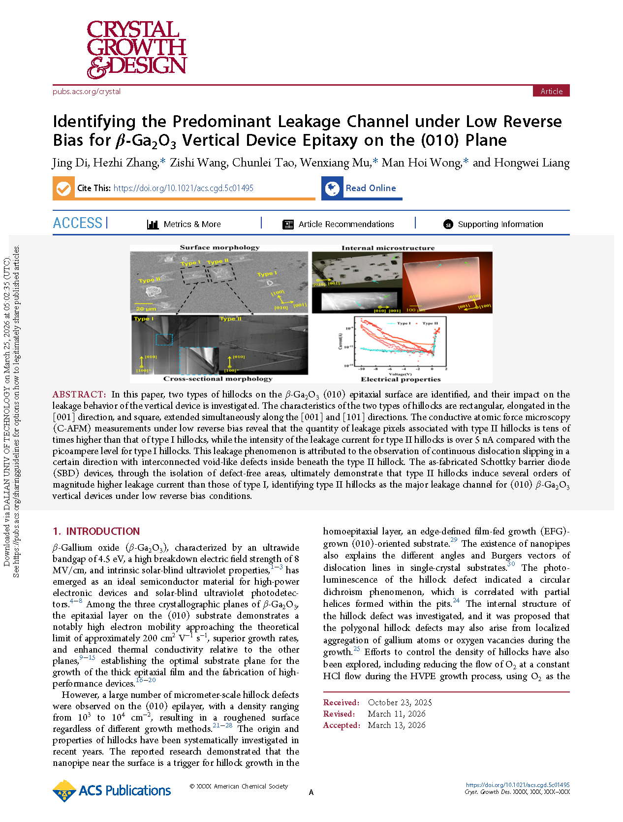 Researchers from the Dalian University of Technology have published a dissertation titled "Identifying the Predominant Leakage Channel under Low Reverse Bias for β‑Ga₂O₃ Vertical Device Epitaxy on the (010) Plane" in Crystal Growth and Design.