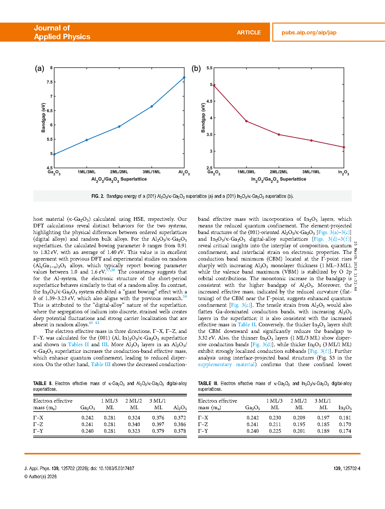 FIG. 2. Bandgap energy of a (001) Al2O3/κ-Ga2O3 superlattice (a) and a (001) In2O3/κ-Ga2O3 superlattice (b).