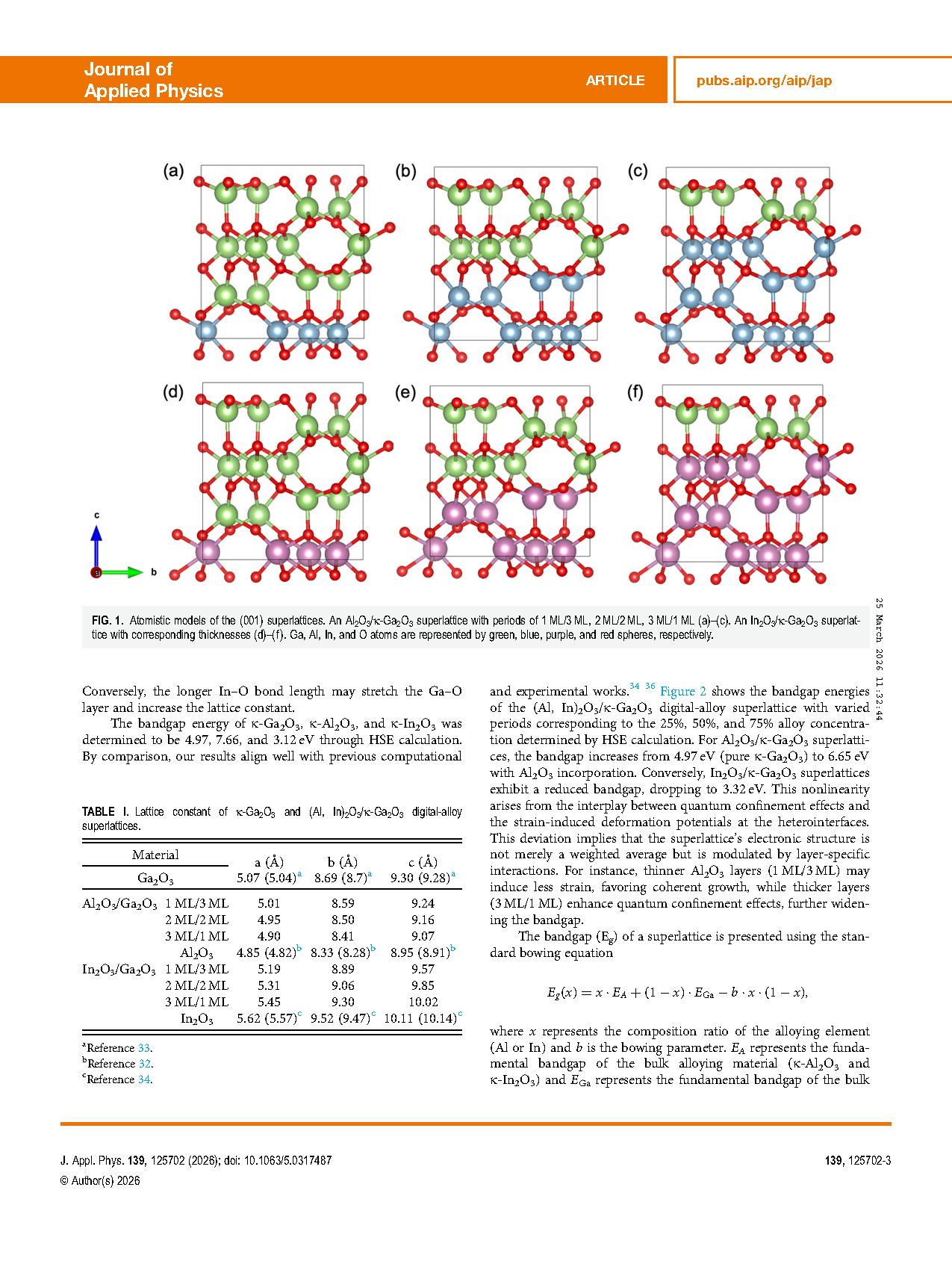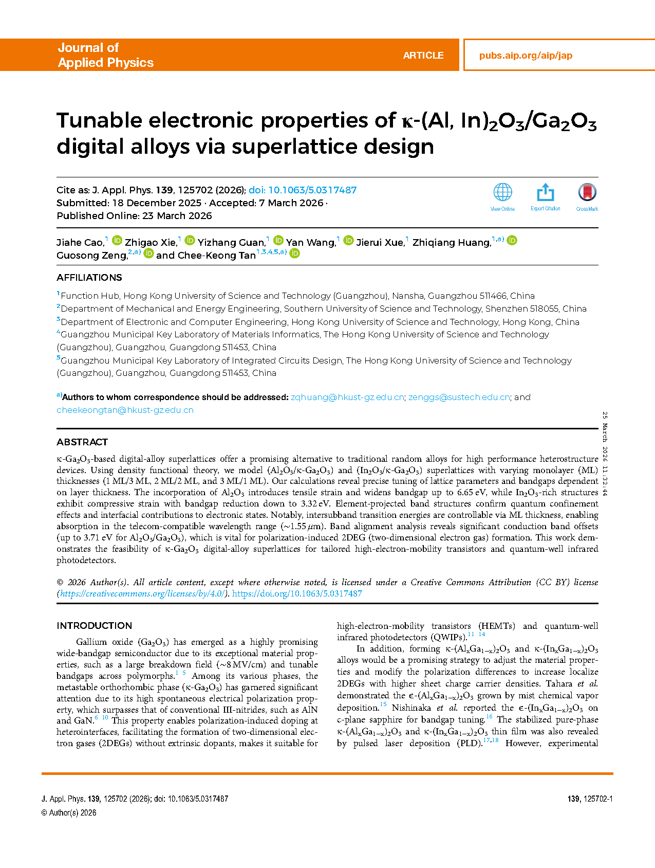 Researchers from the Hong Kong University of Science and Technology (Guangzhou) have published a dissertation titled "Tunable electronic properties of κ-(Al, In)2O3/Ga2O3 digital alloys via superlattice design" in Journal of Applied Physics.