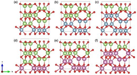 FIG. 1. Atomistic models of the (001) superlattices. An Al2O3/κ-Ga2O3 superlattice with periods of 1 ML/3 ML, 2 ML/2 ML, 3 ML/1 ML (a)–(c). An In2O3/κ-Ga2O3 superlattice with corresponding thicknesses (d)–(f). Ga, Al, In, and O atoms are represented by green, blue, purple, and red spheres, respectively.